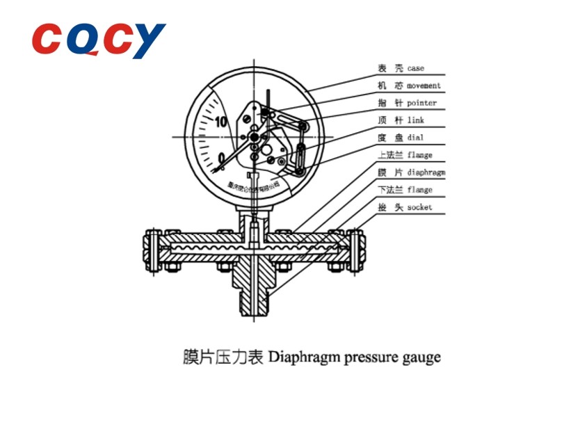 A parte da carcaça adota a estrutura de vedação frontal segura e selada, e a parte de medição utiliza a caixa de filme redonda como elemento sensível elástico, preenchida com óleo amortecedor de baixa viscosidade, de modo que o mecanismo de medição tenha a capacidade de resistir à vibração do ambiente de trabalho ou à pulsação da pressão do meio. O separador de diafragma pode ser dividido em tipo flangeado, tipo roscado, tipo grampo, tipo porca de acordo com seu modo de conexão.